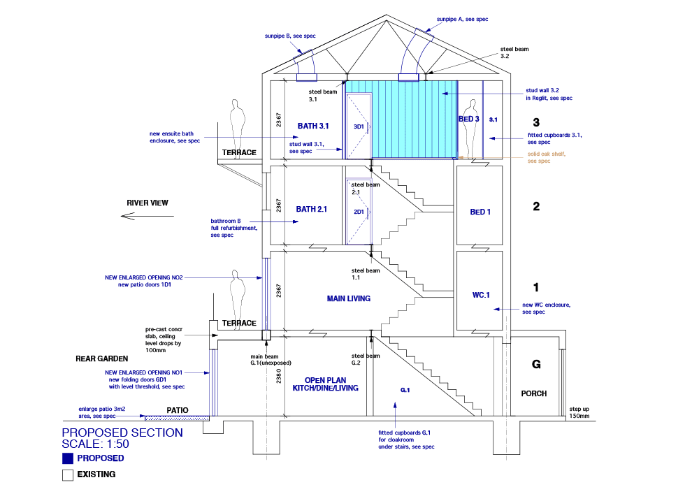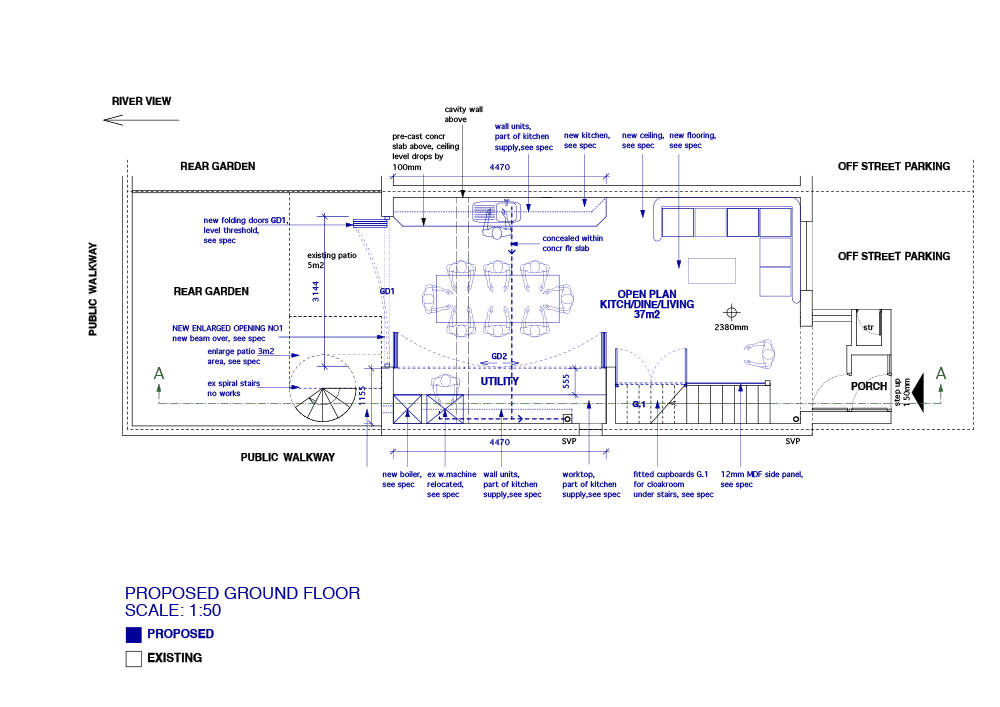 This project incorporated the full internal remodeling and refurbishment of a 4 storey 1980’s built townhouse. The house had a poor and dark internal layout with small room sizes and a small opening to the rear garden which did not maximize it’s riverside location.
