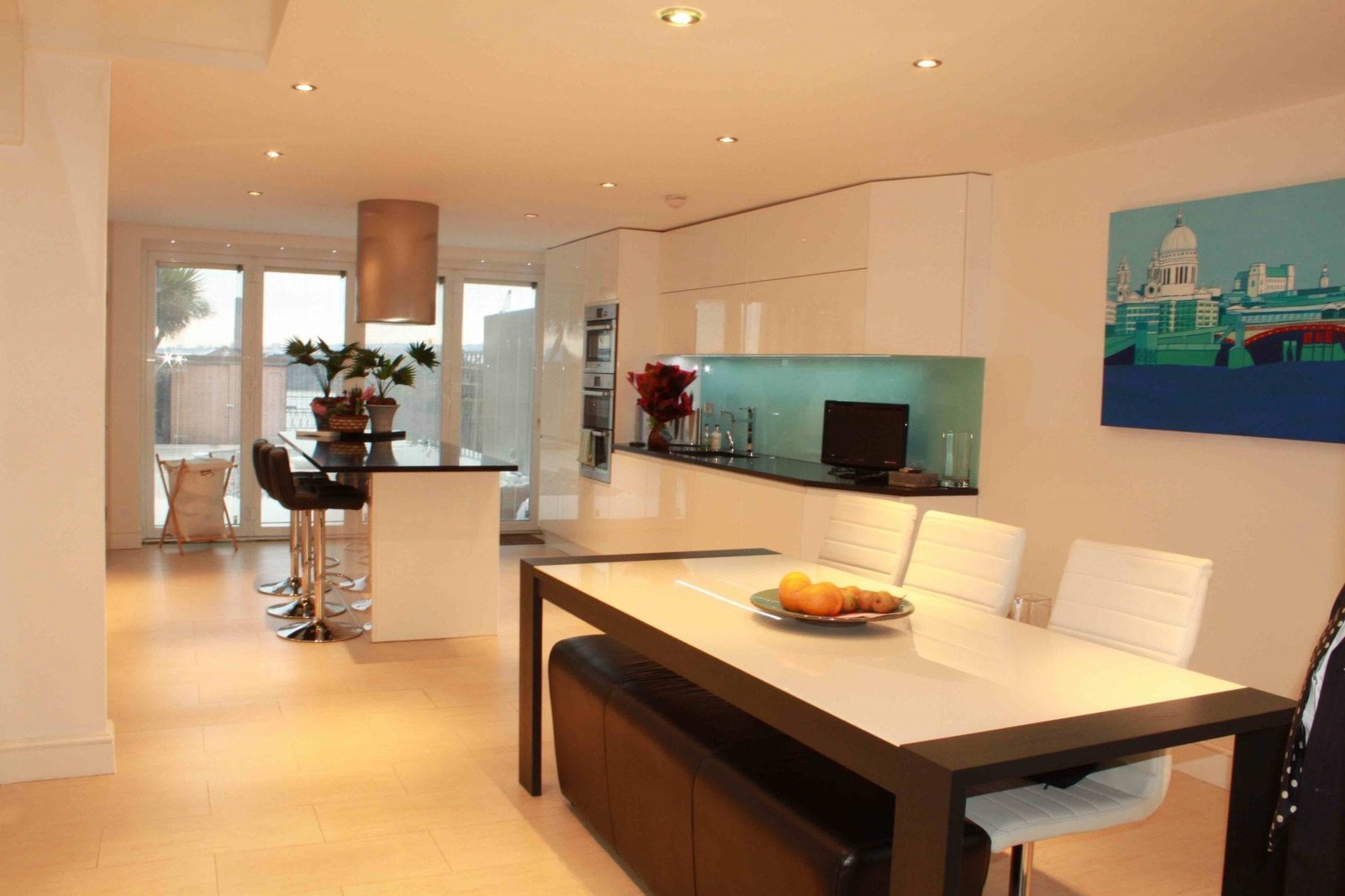 The staircase enclosure walls were removed on the ground and first floors to create bright open plan living areas. On the ground floor this provided space for a large contemporary kitchen with a central feature island and hidden utility area. On the first floor this provided an enlarged living area with a rear terrace to maximize the river view and south facing light. A glass staircase was provided between these floors to enhance the ‘drama’ of moving from one level to the other and make them feel connected more like a double height/ 2 storey family and entertainment space. The bedrooms located on the second floor were remodeled and enlarged to provide more storage with fitted cupboards. The staircase enclosure walls were also removed at the top of the stairs and replaced with clear glass walls to add a ‘wow’ factor to the open plan master bedroom which also provided more natural light including an en-suite shower room.